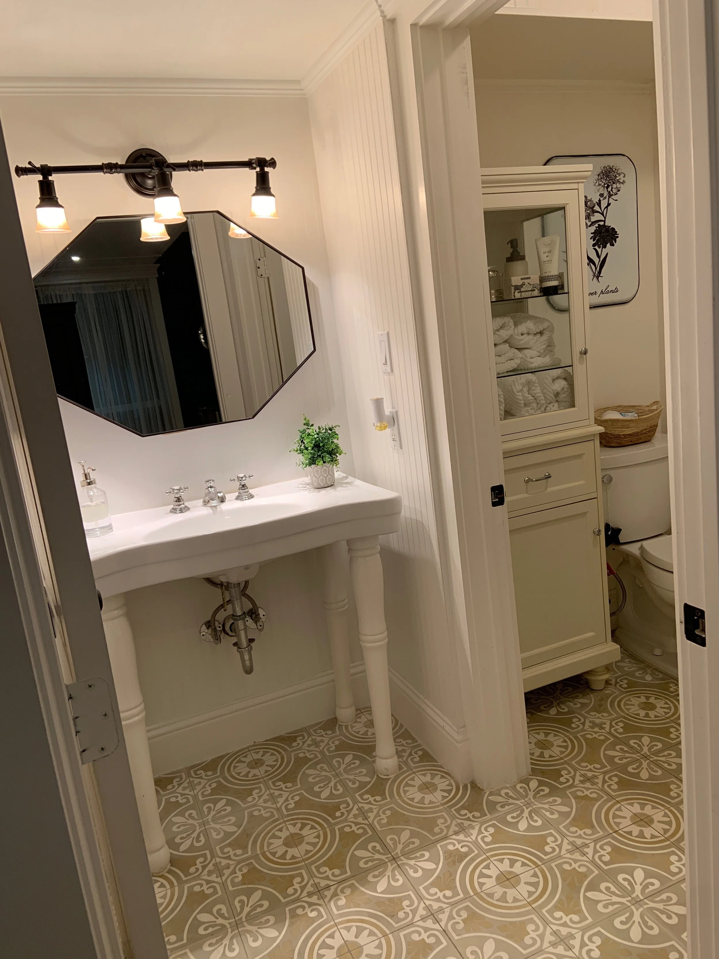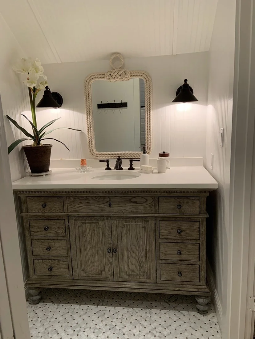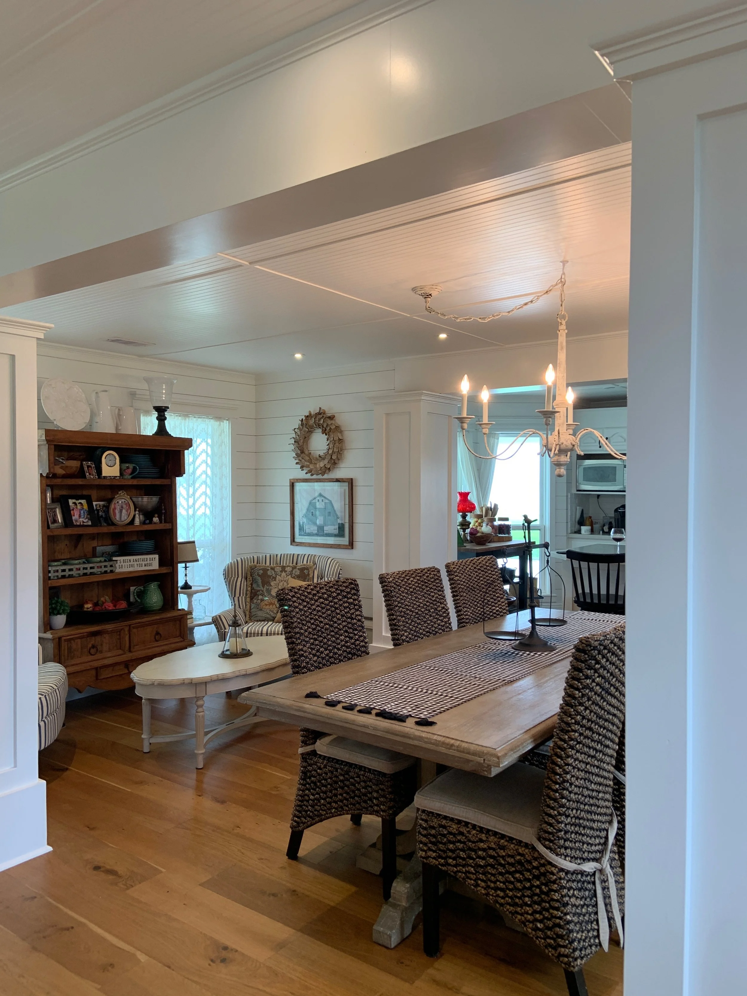 Views, views, views! A wraparound porch, was an essential addition for a couple buying this time capsule of a house, built in 1993. This house was purchased for its sought after waterfront views and needed a remodel. There was not one square foot of this house that was not renovated. The main level floor plan changed most dramatically. We opened up tight, seperate dining room and kitchen to allow for sight lines from the living room to the front of the house, maximizing views to the bay. Every wall, ceiling and flooring surface was updated. By adding touches of vintage inspired light fixtures, selecting warm accent colors, and incorporating many original vintage furniture pieces belonging to the homeowners, we breathed new life into this once dated home, achieving a casual and charming coastal farmhouse.