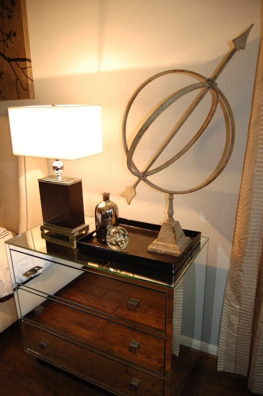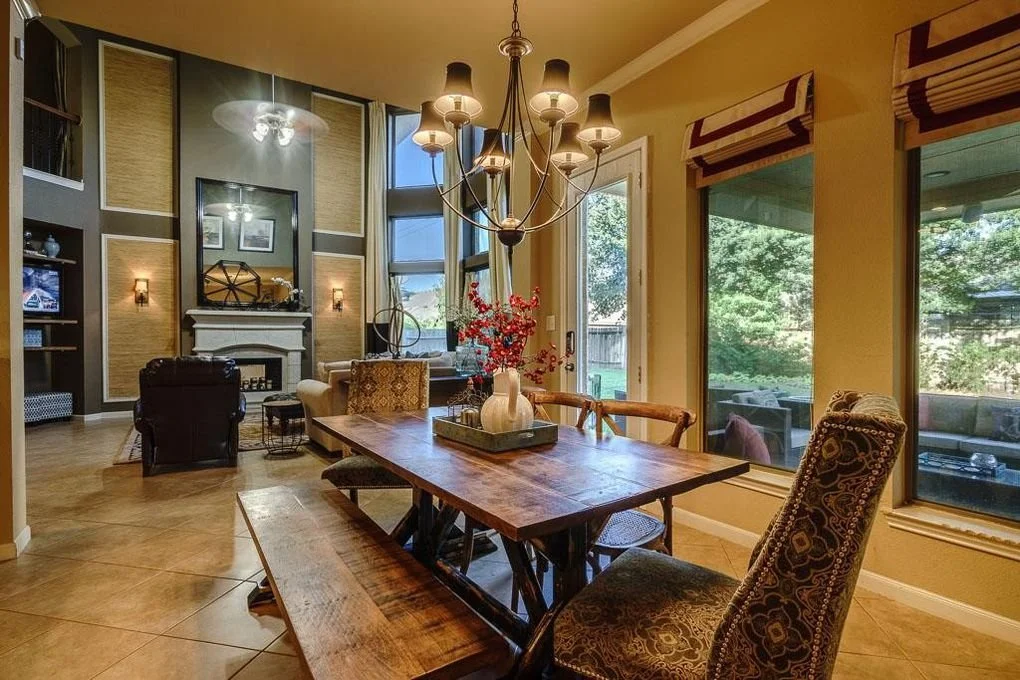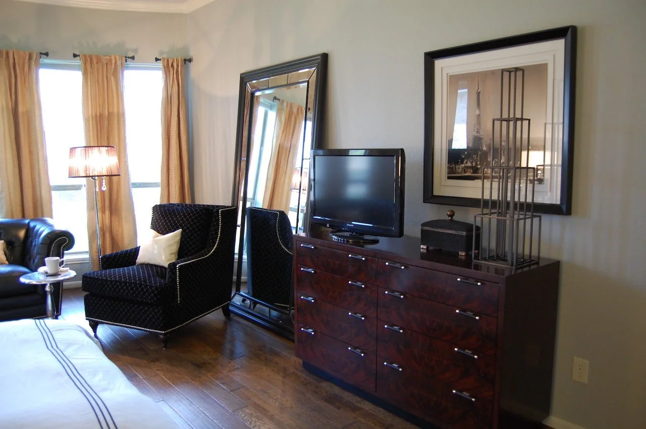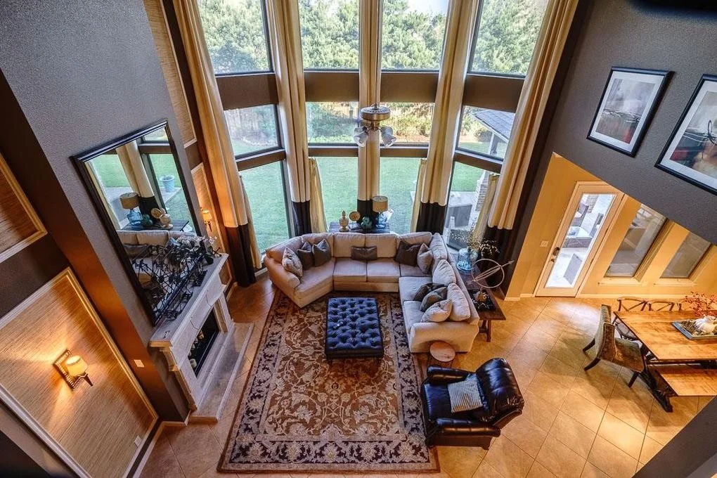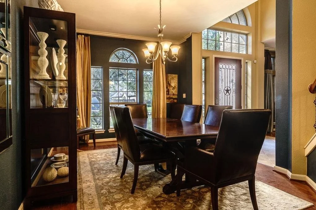 Buying a new build home can be great but also overwhelming, designing from a blank space. For this Houston family, we designed elegant, warm interiors with some custom touches to meet their traditional aesthetic in the formal living room, dining room, and family room. For a personal touch, the owners requested a touch of Hollywood Regency styling in their primary bedroom. A color palette of black, white, and gold, along with mirrored finishes, and velvet and leather fabrics helped us achieve their personal retreat.